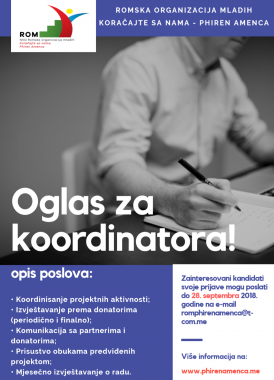 Romska organizacija mladih “Koračajte sa nama – Phiren Amenca” raspisuje konkurs za radno mjesto koordinatora. OBLAST: Koordinacija OPIS Radno mjesto koordinatora će podrazumijevati: – Koordinisanje projektnih aktivnosti; – Izvještavanje prema donatorima (periodično i finalno);