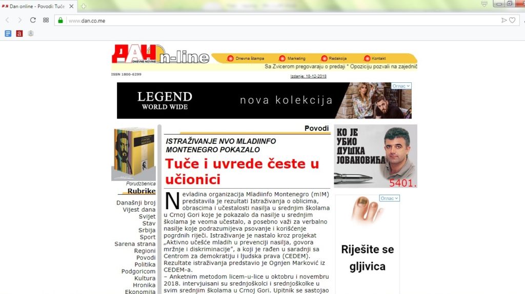 DAN: Istraživanje NVO Mladiinfo Montenegro pokazalo – tuče i uvrede česte u učionici 2018