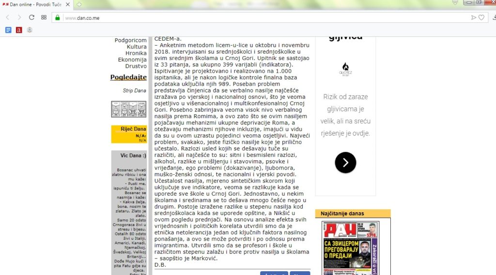 – Anketnim metodom licem-u-lice u oktobru i novembru 2018. intervjuisani su srednjoškolci i srednjoškolke u svim srednjim školama u Crnoj Gori. Upitnik se sastojao iz 33 pitanja, sa ukupno 399 varijabli (indikatora). Ispitivanje je projektovano i realizovano na 1.000 ispitanika, ali je nakon logičke kontrole finalna baza podataka uključila njih 989. Poseban problem predstavlja činjenica da se verbalno nasilje najčešće izražava po vjerskoj i nacionalnoj osnovi, što je veoma osjetljivo u višenacionalnoj i multikonfesionalnoj Crnoj Gori.