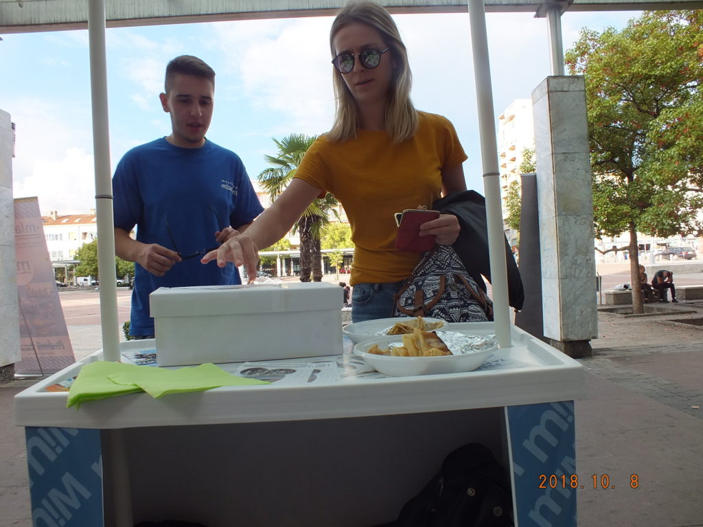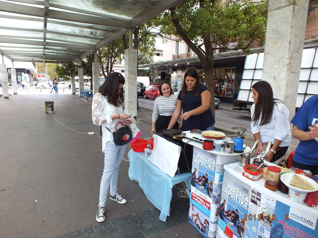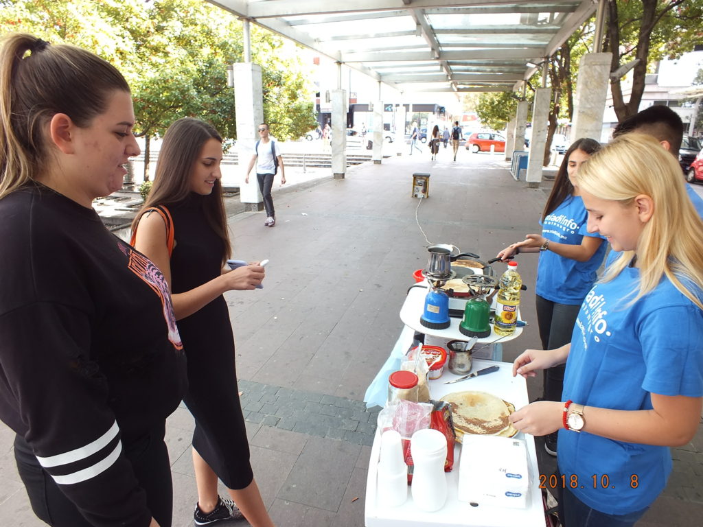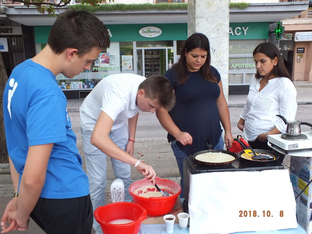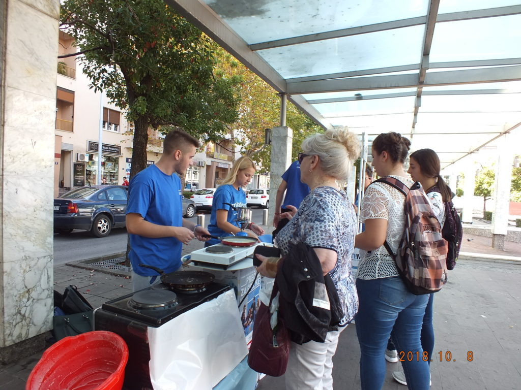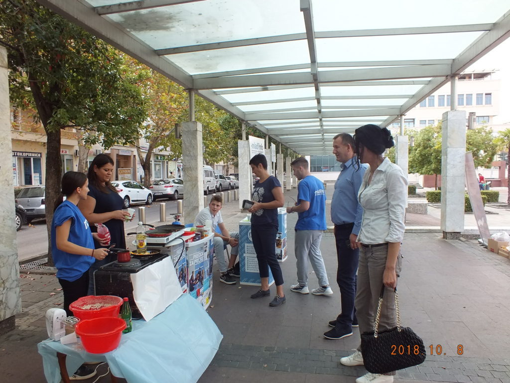 Realizovana akcija samo je dio aktivnosti u okviru planiranih događaja za mjesec oktobar koji je pripremio Volonterski servis m!M-a. Oko trideset volontera na Trgu Nezavisnosti 08.10.2018. pripremalo je palačinke, kuvalo kafe i prikupljalo novčanu pomoć za socijalno ugroženu porodicu sa Konika. Uporedo sa pravljenjem palačinki sakupljane su igračke, knjige, obuća i odjeća, koju će takođe biti uručena socijalno ugroženim porodicama u dogovoru sa Bankom Hrane.