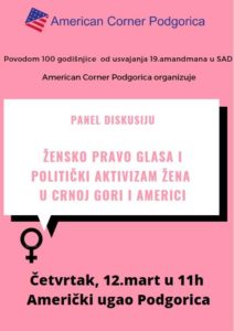 Američki ugao organizuje povodom obilježavanja stote godišnjice od usvajanja 19. amandmana u SAD panel diskusiju ‘’Žensko pravo glasa i politički aktivizam žena u Crnoj Gori’’. Panel diskusija će biti održana u četvrtak, 12. marta u 11 do 13 h u Multimedijalnoj sali KIC-a.