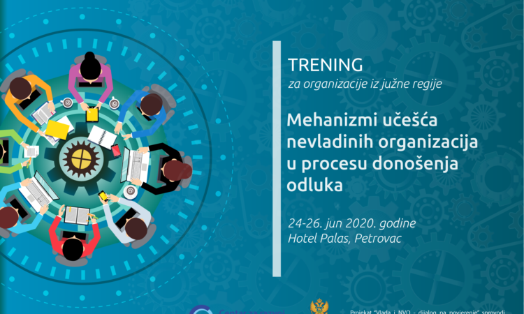 Cilj ove obuke je da učesnici/ce steknu znanje o načinima učešća u procesu donošenja odluka na nacionalnom i lokalnom nivou, kroz učešće na javnim raspravama, konsultacije, podnošenje inicijativa, i slično. Na treningu će se raditi na konkretnim primjerima/problemima u lokalnim sredinama, i odgovarajućim mehanizmima učešća za rješavanje problema. Na treningu je obezbijeđeno 12 mjesta za predstavnike/ce šest organizacija iz južnog dijela Crne Gore koje djeluju na lokalnom nivou (po dva predstavnika/ce koji/e su aktivno uključeni/e u rad organizacije). Trening će se održati u hotelu Palas u Petrovcu od 24-26. juna 2020. godine. CRNVO kao organizator obuke obezbijediće smještaj, hranu i osvježenje za polaznike/ce treninga. Troškovi prevoza biće refundirani u skladu sa autobuskim kartama koje učesnici/e donesu na uvid. Troškovi goriva će se refundirati u slučaju da je najmanje dvoje učesnika/ca došlo istim automobilom, a visina troška će se obračunati na sajtu Via Michelin. Ova obuka predstavlja aktivnost projekta „Vlada i NVO – dijalog pa povjerenje“ koji CRNVO sprovodi uz finansijsku podršku Ministarstva javne uprave.