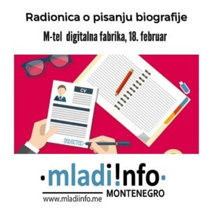 NVO Mladiinfo poziva sve zainteresovane osobe koje žele da nauče kako pravilno napisati svoju biografiju, da se prijave na radionicu koja će biti održana 18-og februara u 18 do 20 h u M tel digitalnoj fabrici u Podgorici.