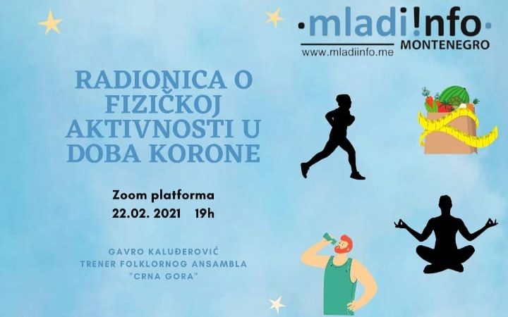 Read moreNVO Mladiinfo Montenegro (m!M) organizuje onlajn radionicu o fizičkoj aktivnosti u doba korone. Radionica će biti održana u ponedeljak 22.02.2021. godine, putem Zoom platforme, sa početkom u 19h. Radionicu će voditi Gavro Kaluđerović, trener folklornog